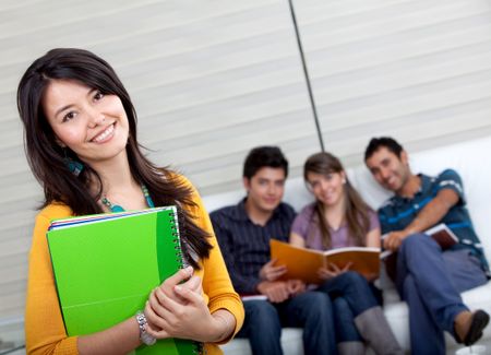 Beautiful female student smiling with a group behind