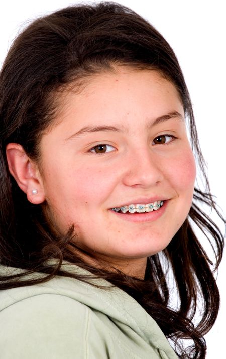 beautiful female teen portrait smiling and showing her braces - isolated over a white background