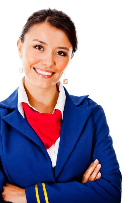 Beautiful flight attendant smiling - isolated over a white background