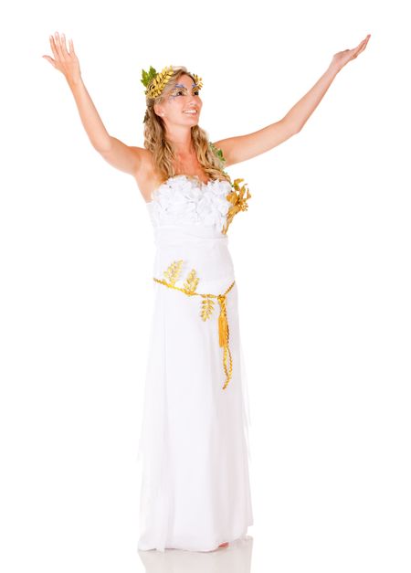 Beautiful fullbody Greek goddess with arms up - isolated over white