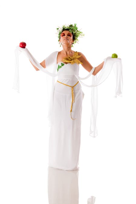 Beautiful fullbody Greek goddess holding apples - isolated over a white background
