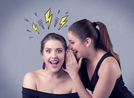 A beautiful girl in black dress sharing secrets to her girlfriend concept with drawn energetic electric yellow signs above her head on the wall background.