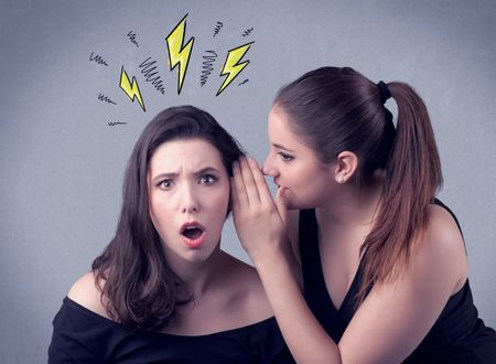 A beautiful girl in black dress sharing secrets to her girlfriend concept with drawn energetic electric yellow signs above her head on the wall background.