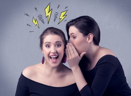 A beautiful girl in black dress sharing secrets to her girlfriend concept with drawn energetic electric yellow signs above her head on the wall background.