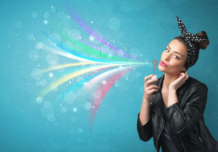 Beautiful girl blowing abstract colorful bubbles and lines on blue background