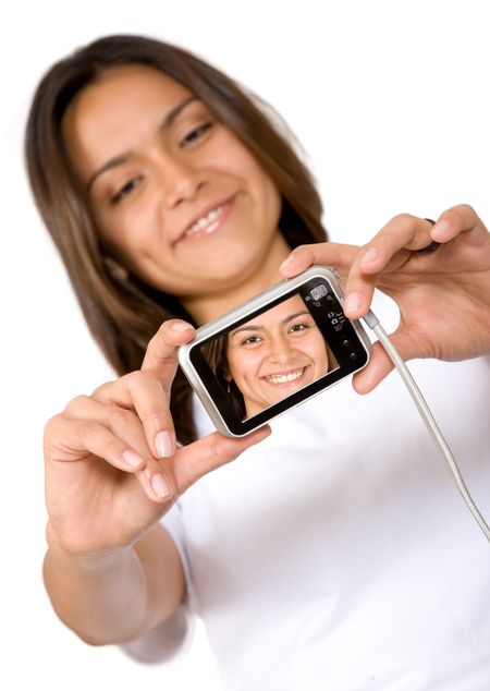 beautiful girl with a camera taking a photo of herself - focus is on camera