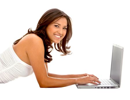 Beautiful girl with a computer isolated on white