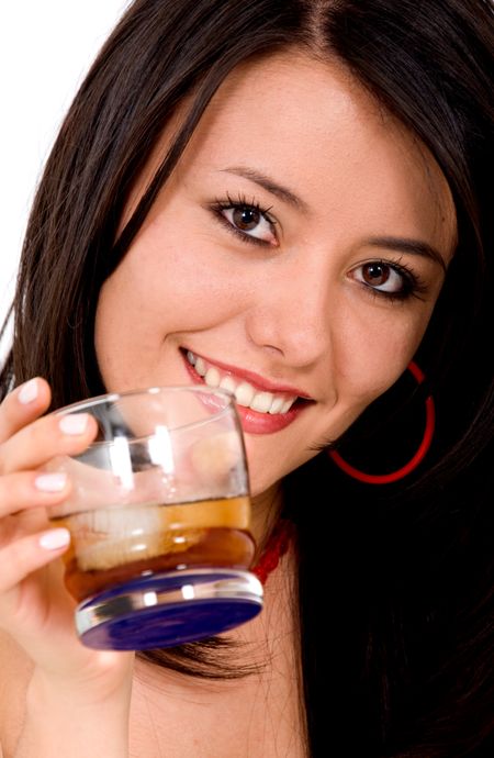 beautiful girl with a drink on her hand - smiling over a white background