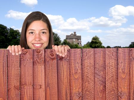 beautiful girl over a fence with a house in the background