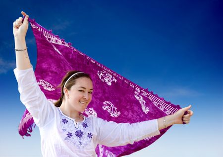 beautiful girl having fun at the beach waving a purple sarong