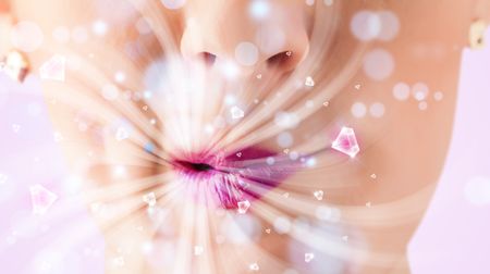 Beautiful girl mouth breathing abstract white lights and crystals close up