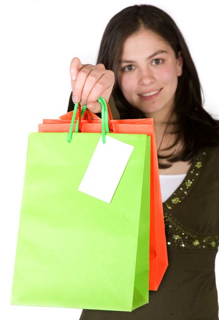 beautiful girl with shopping bags over white