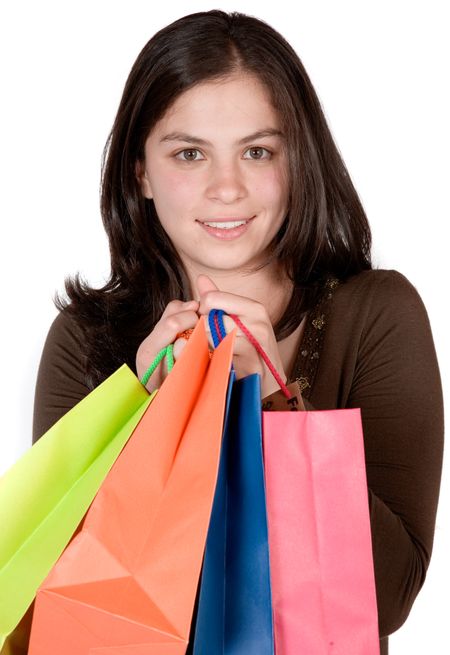 beautiful girl with shopping bags over white