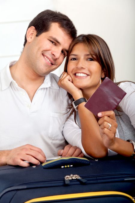 Beautiful happy couple waiting for a trip