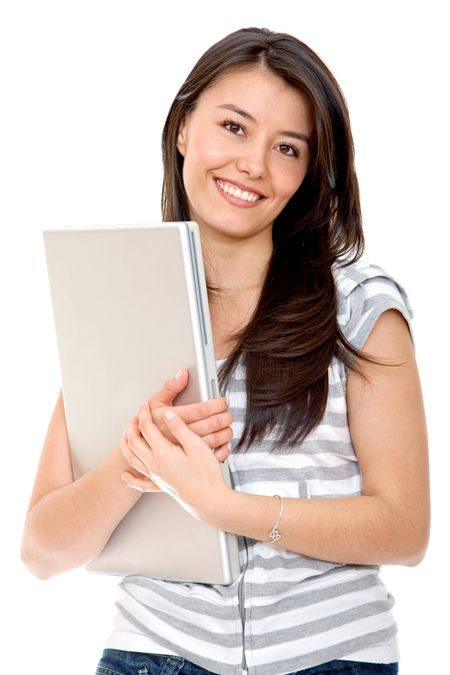 Beautiful happy girl with a laptop isolated on white