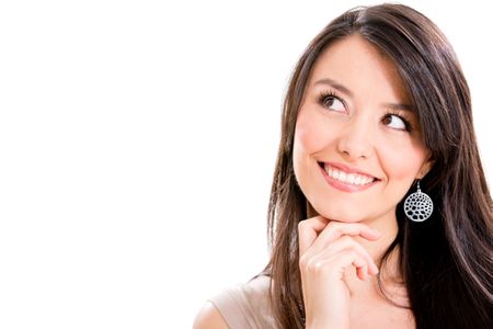 Beautiful pensive woman portrait - isolated over a white background