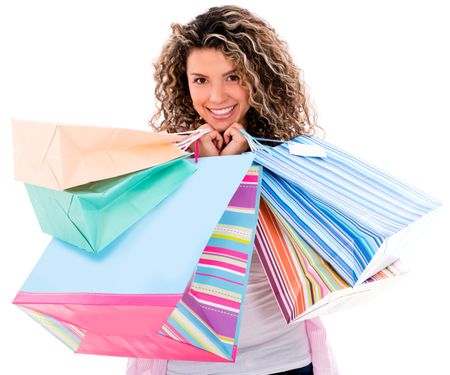 Beautiful shooping woman smiling - isolated over a white background