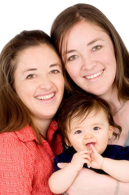 Beautiful sisters very happy with the daughter of one of them over a white background