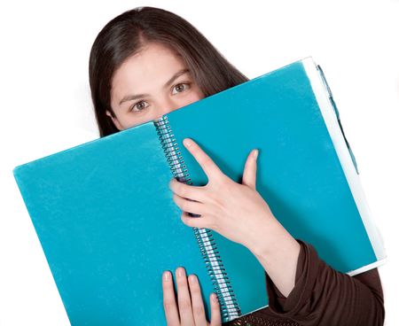 beautiful student hugging a cyan notebook over white background