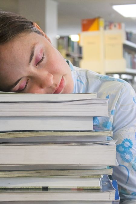 Beautiful student sleeping in the library on top of some books.