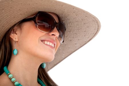 Beautiful summer woman smiling with hat and sunglasses over a white background