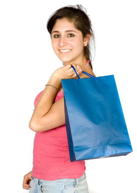 beautiful teenager with shopping bags over white