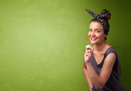 Beautiful woman blowing soap bubble on copyspace green background