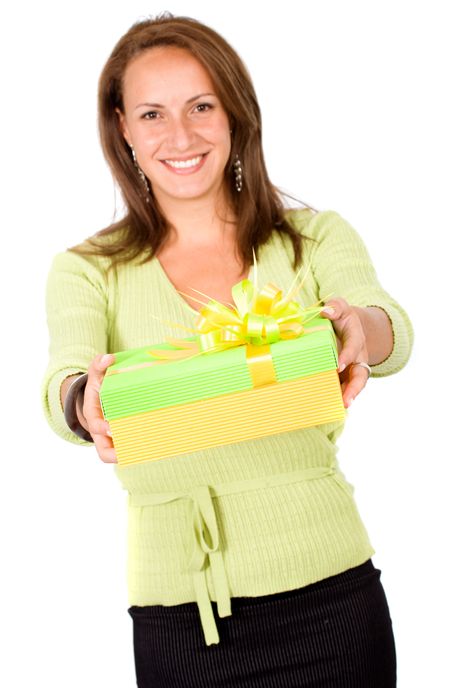 beautiful woman carrying a gift smiling over a white background