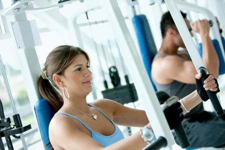 Beautiful woman doing exercise her arms at the gym