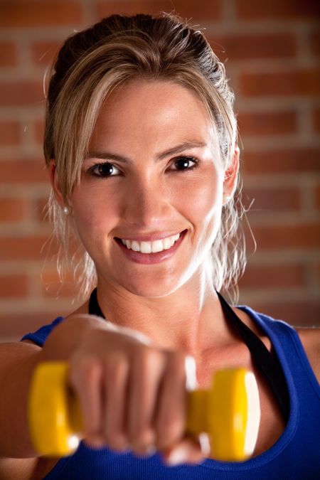 Beautiful woman exercising with free-weights and smiling