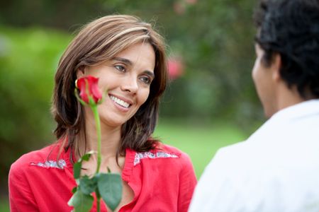 Beautiful woman getting a red rose from his partner outdoors