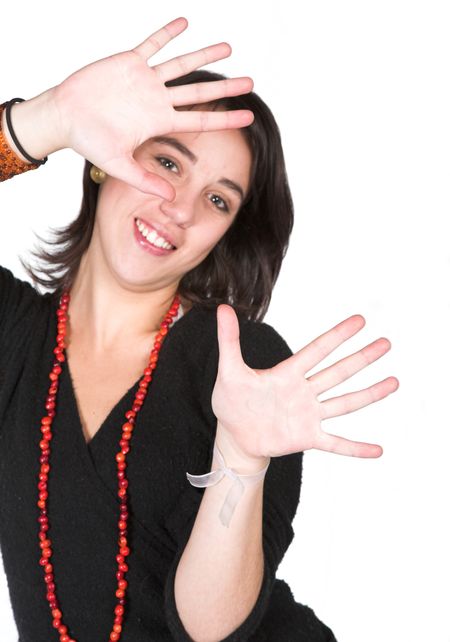 beautiful woman with hands by the face over white