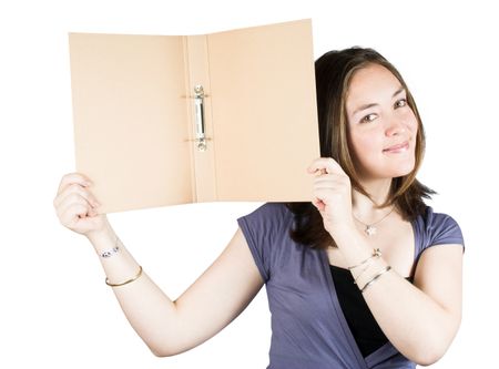 beautiful woman holding a folder over a white background