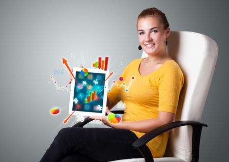 beautiful woman holding modern tablet with colorful diagrams and graphs