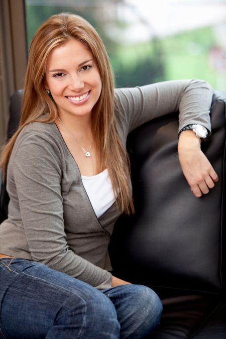 Beautiful woman at home sitting on a sofa and smiling