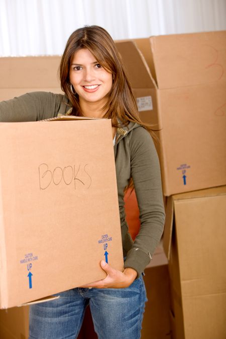 Beautiful woman moving house and carrying boxes