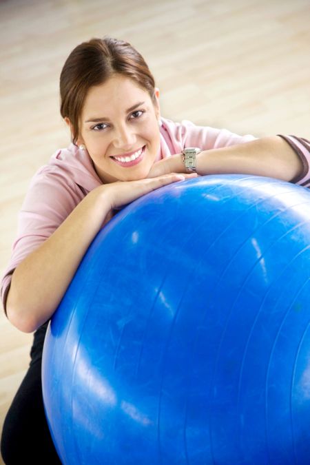 beautiful woman portrait at the gym smiling leaning on a pilates ball