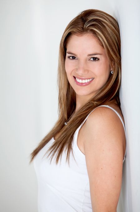 Beautiful woman portrait smiling and leaning against a wall