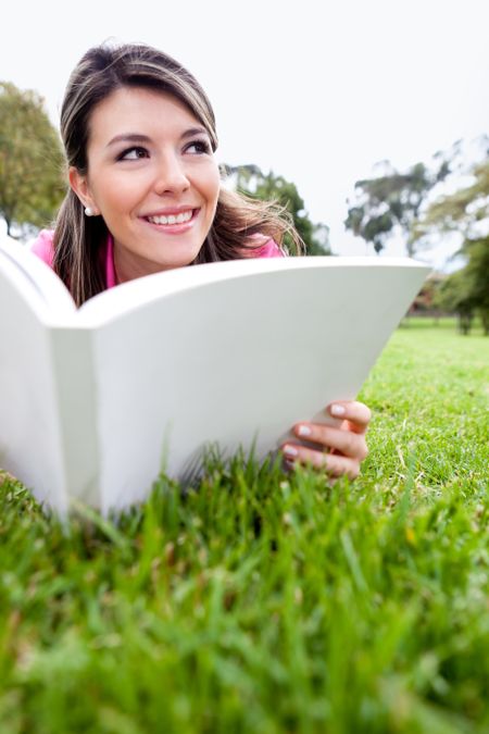 Beautiful woman reading a book outdoors and smiling