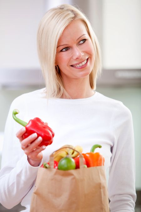 Beautiful woman with a shopping bag full of fruits and vegetables