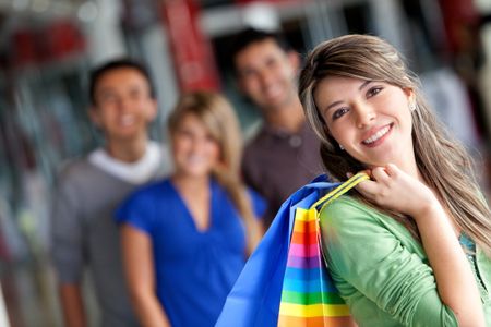 Beautiful woman smiling at a shopping center with bags