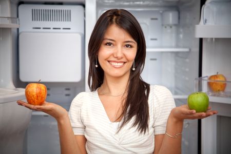 Beautiful woman taking fruits from the fridge and smiling