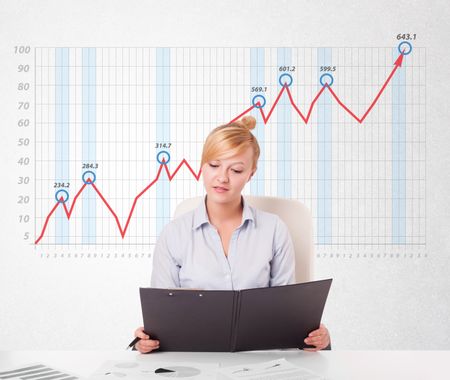 Beautiful young businesswoman calculating stock market with rising graph in the background
