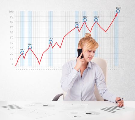 Beautiful young businesswoman calculating stock market with rising graph in the background