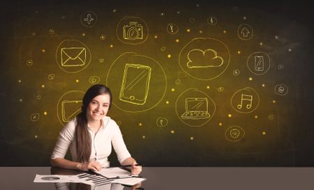 Beautiful young businesswoman with all kind of hand-drawn media icons in background