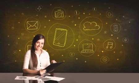 Beautiful young businesswoman with all kind of hand-drawn media icons in background