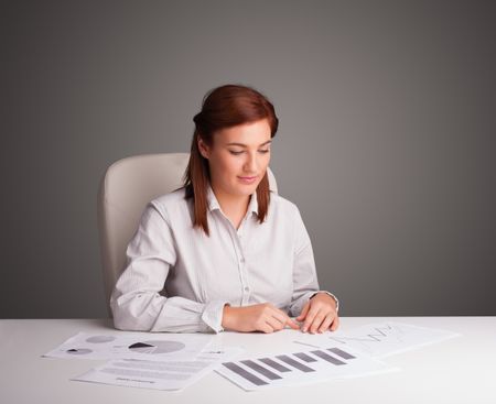 Beautiful young businesswoman sitting at desk and doing paperwork