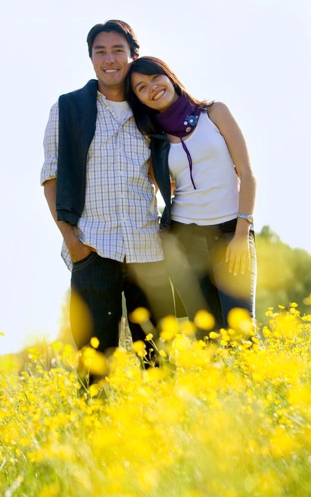 Beautiful young couple in a meadow smiling
