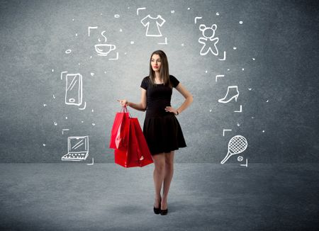 A beautiful young girl in black standing with red shopping bags in front of urban wall background and laptop, shoes, tennis icons concept