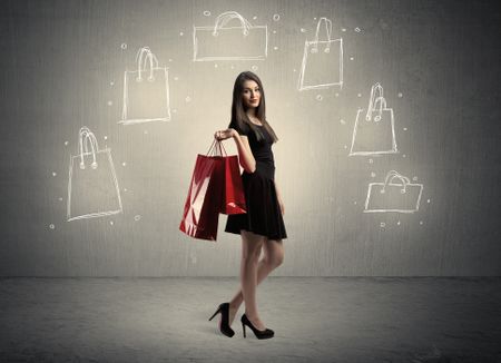 A beautiful young girl in black standing with red shopping bags in front of brown background wall and drawing illustration concept